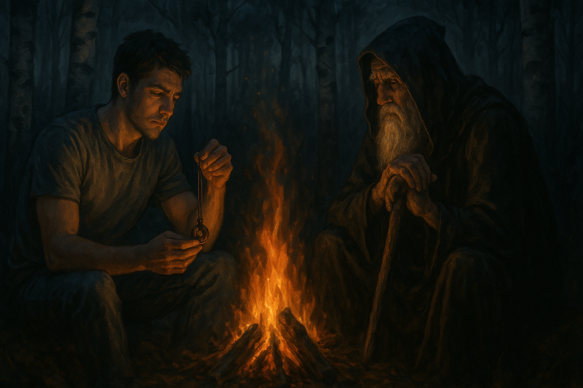 Костёр — ровный, живой, с тонким столбом дыма, уносящимся в купол листвы. Рядом на толстом валежнике сидел он — старик в поношенной мантии, с посохом, воткнутым в землю рядом, будто он рос оттуда, из самого корня мира. Его лицо было освещено отблесками огня, но взгляд оставался в тени.