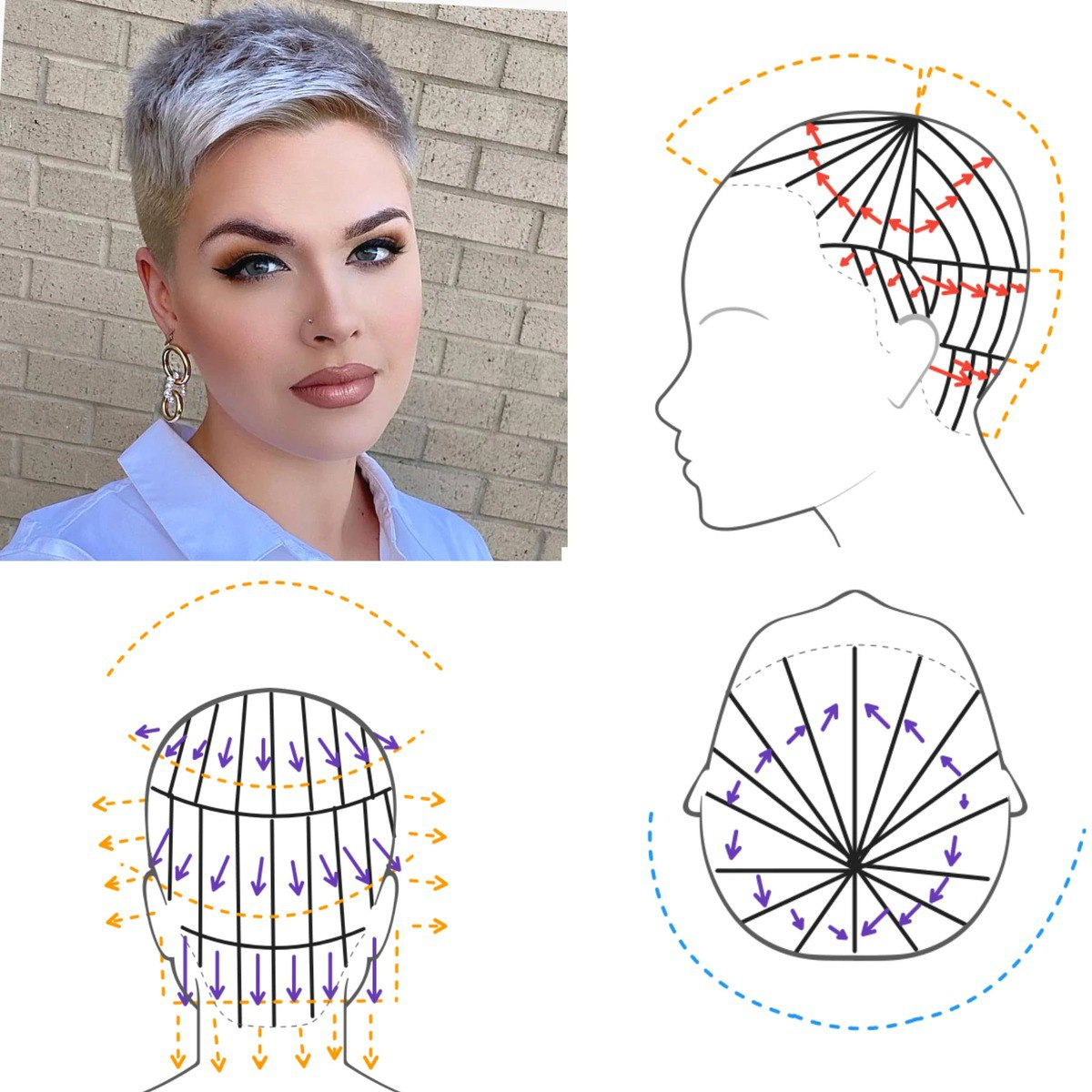 Когда клиентка говорит: «Хочу коротко, но не как у мужчины» — я понимаю, насколько хрупкий тут баланс. Потому что короткая стрижка может быть элегантной и выразительной, а может подчеркнуть черты, от которых наоборот хотелось бы отвлечь. Всё решают нюансы. 🟢 Почему стойкая краска на длину волос — это ошибка На фото — стрижка, которая выполнена в технике, максимально подчёркивающей форму черепа. Височные и нижний затылочный блок — прострижены очень коротко. Это подчёркивает скулы, открывает шею и даёт чёткий, аккуратный силуэт. Но! Если хочется меньше строгости — эти зоны можно оставить чуть длиннее, не теряя формы. 🟢 Чем смыть краску для волос с кожи Основная выразительность здесь — во фронтально-теменной секции. Если простригать её полностью радиальными проборами (как на правой верхней схеме), получится равномерный, мягкий купол. А если у лица задать радиальные проборы, а затылок простричь вертикально — получится современная многоплоскостная форма с направлением и текстурой. 🟢 Кака