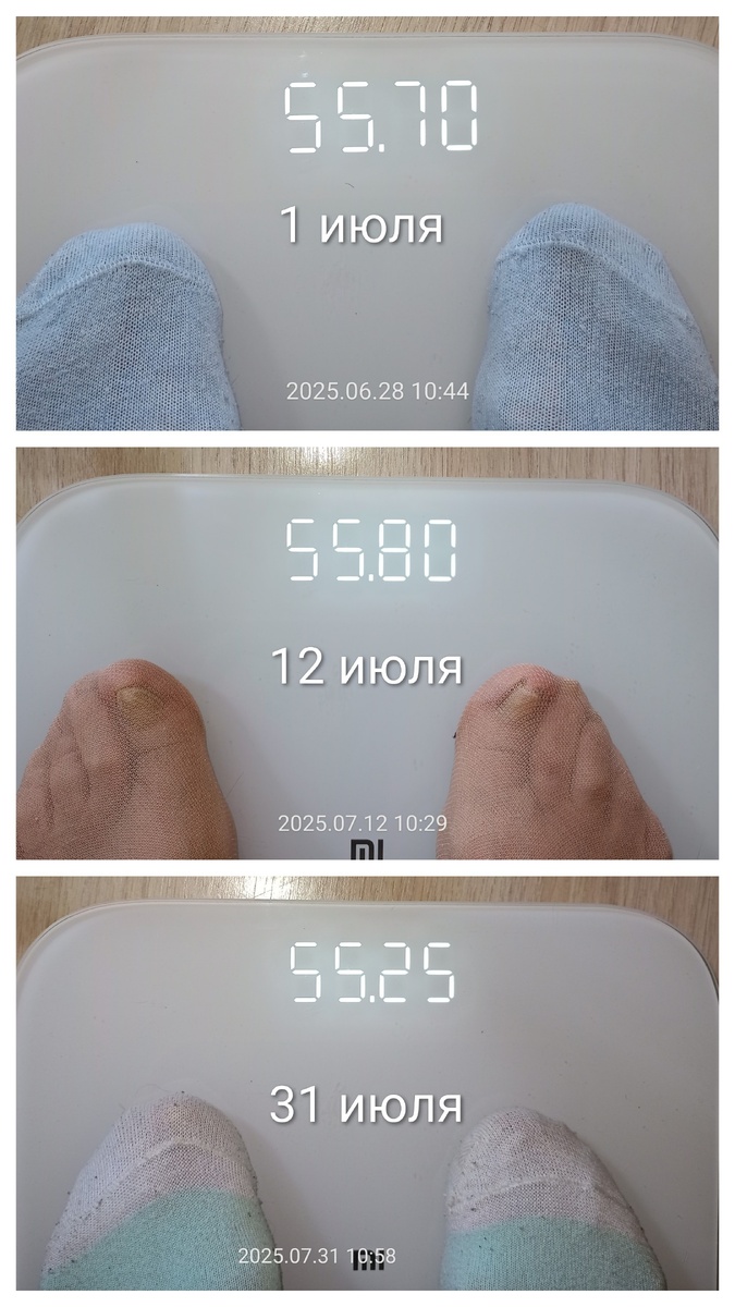 Всем привет! С Вами Татьяна, пенсионерка. Мне 74 года, рост 151 см, вес 55 кг ✅ 27.02.23 мой вес был 82 кг. В процессе своего похудения в течение 2023-25 года я сбросила 27 кг лишнего веса. *** Изменения веса в течение месяца 👇 Изменения веса за 2023-25 год👇 Изменения средней суточной калорийности по месяцам за 2025 год. 👇 Изменения объёмов фигуры👇 Вес в июле был в диапазоне 55 кг с граммами. Мне удалось снизить вес с 56-57 кг без физической активности, только снижением суточной калорийности питания. Помог мне в этом Петров пост до 11 июля и пищевые паузы по средам и пятницам. Голода нет, если бы хотелось есть, съела бы суп или борщ, но не хочется. Движение практически отсутствует, зачем наедаться? После 11 июля я на две недели уехала на дачу, но питание не изменилось. Искушений нет, так как внук на диете из-за проблем с ЖКТ. Он, кстати, за полгода похудел на 10 кг, питаясь здоровой пищей. Очень доволен. Пока жила на даче перестала заниматься ходьбой на месте.