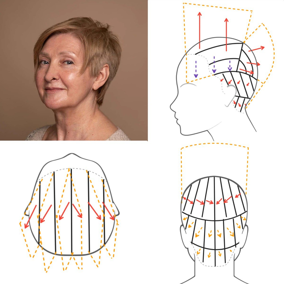 Если бы мне нужно было назвать одну стрижку, которая чаще всего вызывает восторг в зеркале у женщин 50+, — это была бы Пикси. Причём не в классическом понимании, а в современной, чуть «рваной», текстурной подаче. Такой, как на этой схеме и фото. 🟢 Чем красить корни волос и длину Что делает Пикси идеальной для возрастного образа? Во-первых — фронтально-теменная зона. Она прострижена с хорошей оттяжкой вверх и вперёд, что создаёт воздушный объём у лица. Именно он визуально вытягивает овал, делает черты мягче и как бы подтягивает лицо. Во-вторых — выраженная текстура. Пряди не прилипают к голове, а двигаются, живут. Это создаёт ощущение лёгкости. Стрижка как бы дышит вместе с вами, а не сидит, как шапка. 🟢 Лёгкая стрижка круглой формы Техника несведённых зон — это как раз тот приём, который делает Пикси интересной. Затылок и виски могут быть прострижены отдельно от верха. За счёт этого нет скучного симметричного перехода, а форма выглядит более динамичной. На схеме это прекрасно видно: