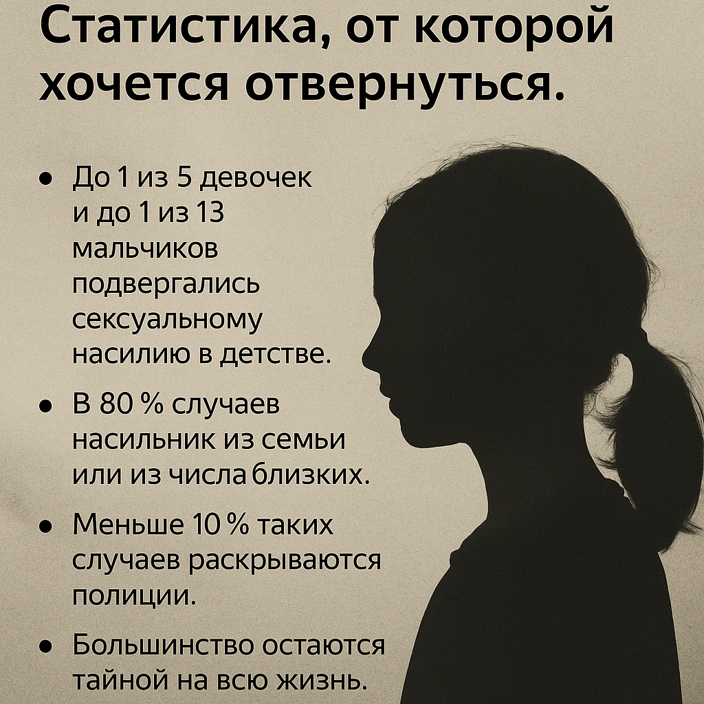 что это где‑то, но не здесь. Но цифры говорят другое. 📊 По данным ВОЗ и ЮНИСЕФ, до 1 из 5 девочек и до 1 из 13 мальчиков подвергались сексуальному насилию в детстве.