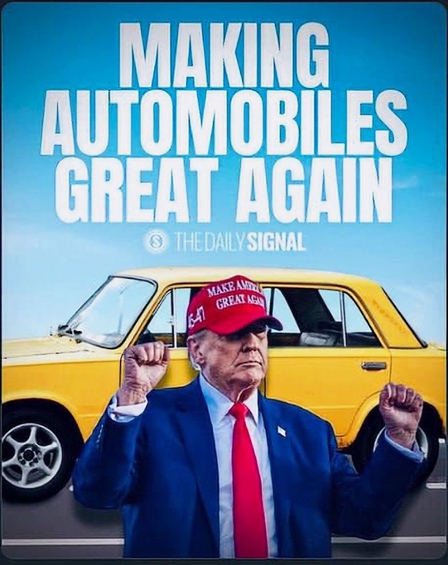 Президент США «сделал ставку» на советский автопром А что мы всё про санкции, да про Украину? Давайте про приятное поговорим. Вот сейчас часто приходится слышать про то, что Трамп строит нам козни. Дескать, то он обещает тарифы под 500% врубить, то поставить в зону конфликта (со стопроцентной европейской предоплатой) какое-то дивное американское оружие, против которого ни одна наша противоракетно/танко/пехотная система не устоит, то грозится в миг, вот как руки дойдут, нашу экономику развалить… Всё это гнусные наветы! Да какой развалить, когда он за неё так радеет! В частности – за наши автомобили. Не зря же на сайте Республиканской партии выложили фото Трампа на фоне жёлтой советской «копейки», с обещанием не только опять сделать Америку великой, но и принять вскоре какой-то невиданно-полезный и посвященный американскому автопрому закон, который сделает его тоже «опять великим». Никак, американцы собираются купить у нас лицензию на производство ВАЗ-2101, либо организовать в давно прев