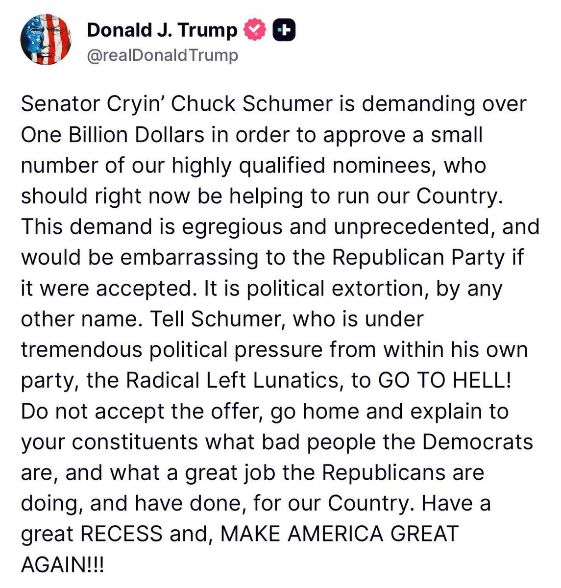 Trump accuses Chuck Schumer of political EXTORTION Tells him to ‘GO TO HELL’