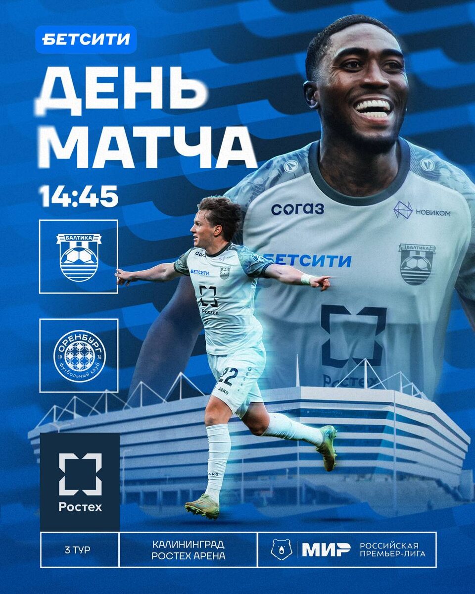 ДЕНЬ МАТЧА 💙 Сегодня проведем первый домашний матч сезона — сыграем против «Оренбурга». ⏰ 14:45 (КГД) 🏟️ «Ростех Арена» 🎟️ Билеты на матч 📺 Трансляция матча 🎙 🎙 ❗️ Напоминаем, что для посещения матчей Мир РПЛ требуется карта болельщика ⏰ Вход будет открыт за 2 часа до начала матча — в 12:45, обязательно приходи заранее! Вперед, Балтийцы 🌊