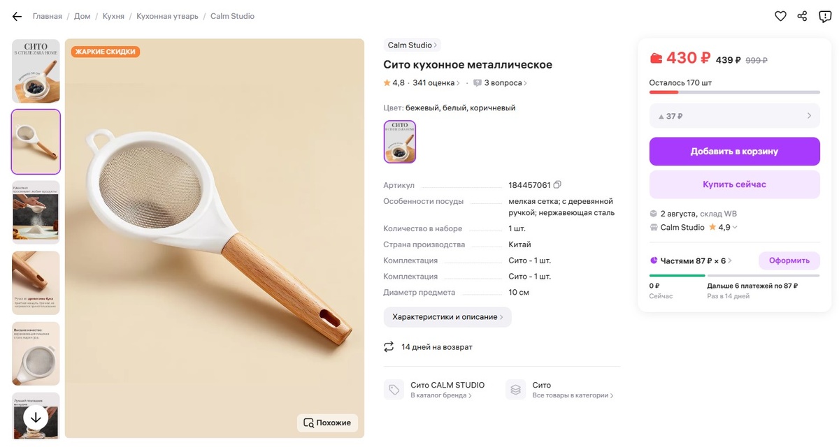 источником идей и хорошего настроения! Люблю уют на кухне и практичные вещи, которые не просто лежат на полках, а реально облегчают жизнь. В этой подборке собрала свои любимые находки — они простые, стильные и максимально полезные. Проверено лично: с ними готовка стала в разы комфортнее, а интерьер приобрёл аккуратные штрихи уюта. Возможно, и вам что-то из этого списка пригодится! Компактное и удобное, это сито стало моим незаменимым помощником на кухне. Выполнено из прочной нержавеющей стали, не ржавеет и не впитывает запахи. Деревянная ручка приятная на ощупь и не нагревается. Продуманная форма позволяет фиксировать сито на чашке или кастрюле - руки свободны, а процесс комфортный. Подходит для просеивания муки, сахарной пудры, фильтрации чая или кофе, промывания круп, а также для приготовления пюре и соусов. Главное - мыть только вручную. Артикул: 18445706