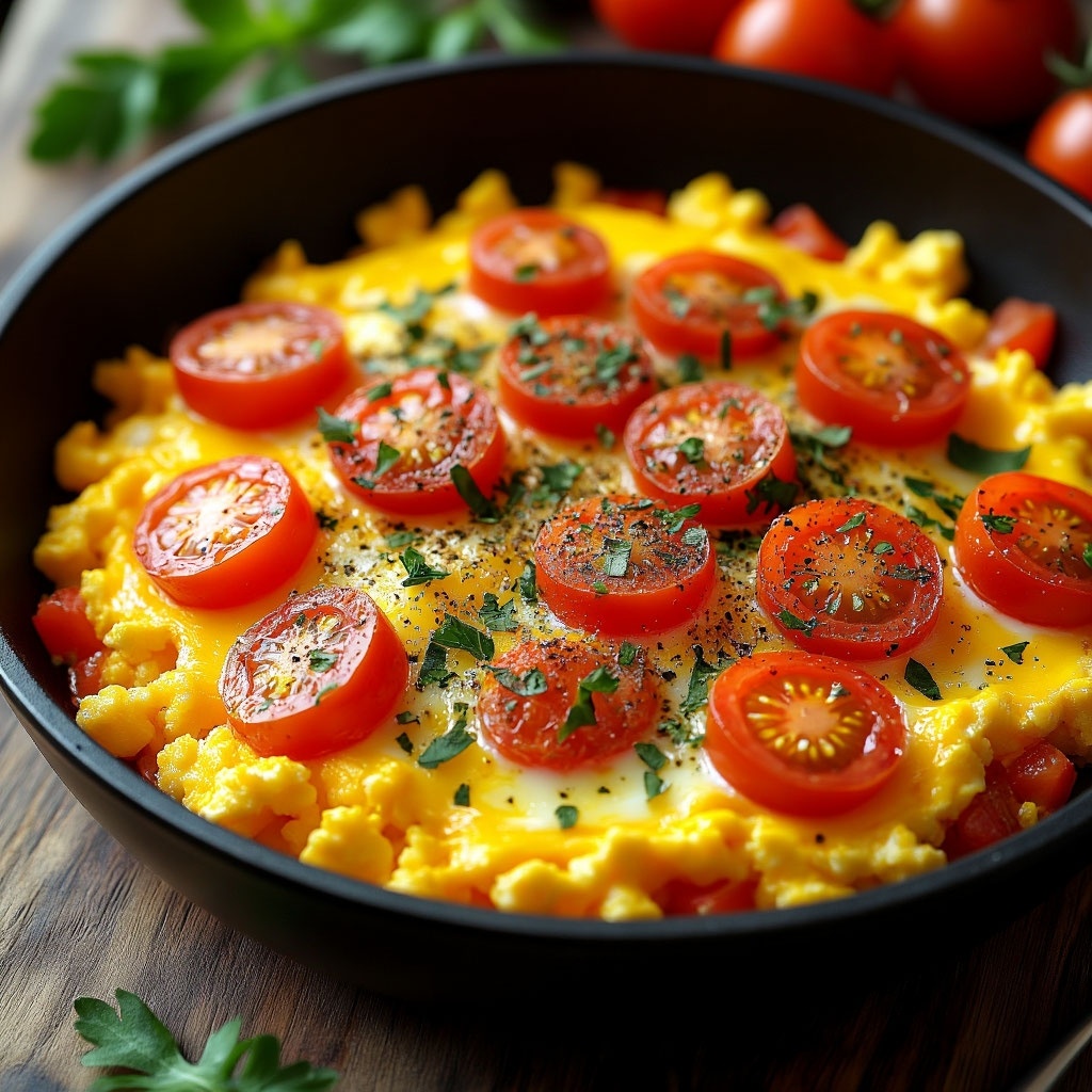 * Залейте овощи яичной смесью и готовьте под крышкой на медленном огне до готовности.