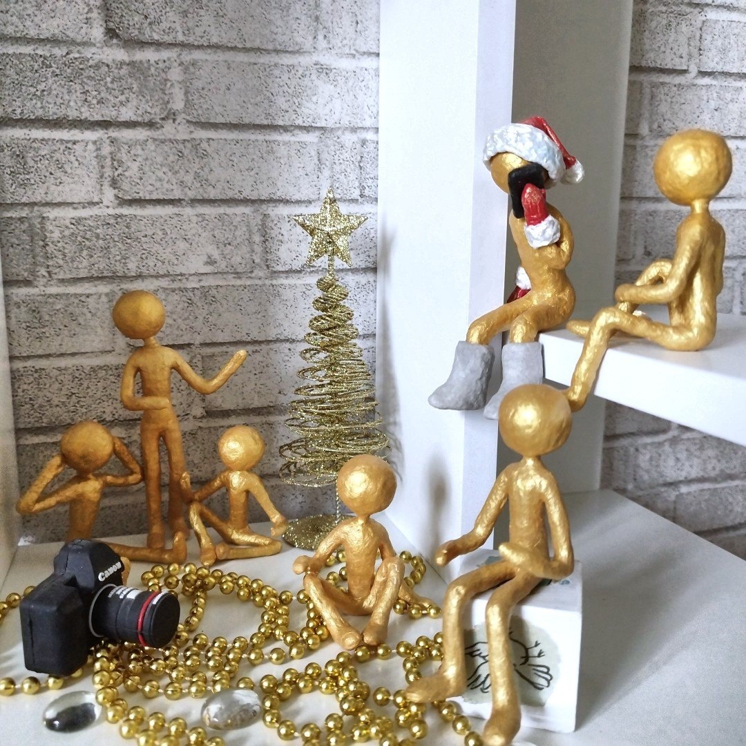 Золотые человечки – украшение интерьера. Они все разные, повтора нет. Кто сидит, кто стоит. Есть летний вариант, а есть зимний
