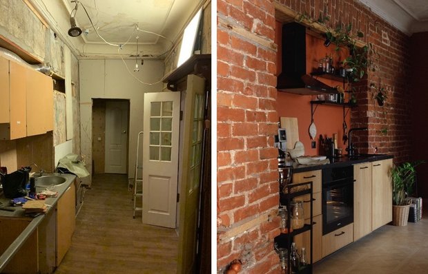 Инженеры Нина и Андрей всстановили исторические детали и наполнили интерьер личными акцентами Хозяева этой квартиры — супруги-инженеры Нина и Андрей — обожают ремонт и уже в третий раз превращают старый фонд в уютное и стильное пространство. В этот раз они сохранили все, что напоминало о дореволюционной истории дома 1905 года: от метлахской плитки до кирпичной кладки. Кухня-гостиная стала сердцем квартиры — теплой, яркой и функциональной. Гарнитур разместили в нише, отказались от верхних шкафов в пользу открытых полок, а стены выкрасили в терракотовый. Комната получилась живой и атмосферной. Кухонная зона аккуратно встроена в нишу с кирпичными стенами: их расчистили вручную и оставили в первозданном виде. В качестве фартука используется окрашенная влагостойкая штукатурка насыщенного терракотового оттенка. Сверху расположились черные полки с любимыми предметами: посудой, специями и зеленью в горшках. Вместо навесных шкафов — легкость и визуальный простор. Нижние фасады выполнены из свет