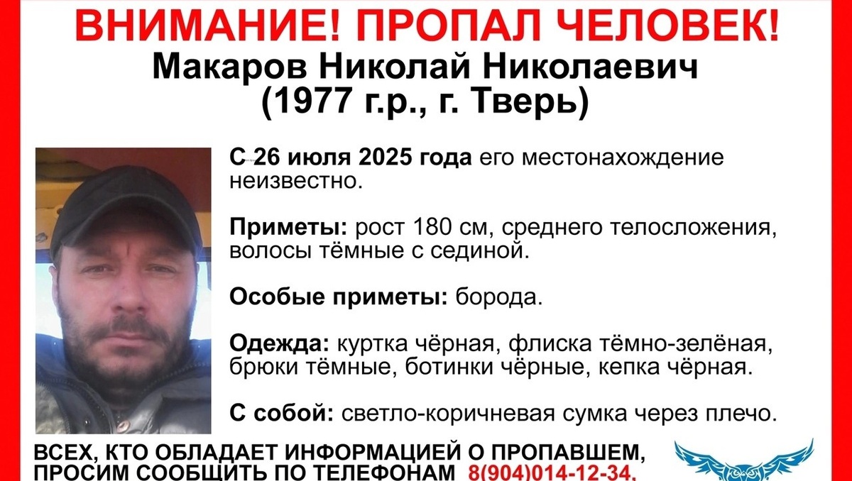 В Твери пропал 48-летний Николай Николаевич Макаров. Как сообщает тверской волонтерский поисково-спасательный отряд "Сова", с 26 июля местонахождение мужчины неизвестно. Приметы: рост 180 см, среднего телосложения, волосы тёмные с сединой. Особые приметы: борода. Одежда: куртка чёрная, флиска тёмно-зелёная, брюки тёмные, ботинки чёрные, кепка чёрная. С собой: светло-коричневая сумка через плечо. Волонтеры просят сообщать информацию о пропавшем в отряд по телефонам: 8 (910) 646-34-34 и 8 (904) 014-12-34.