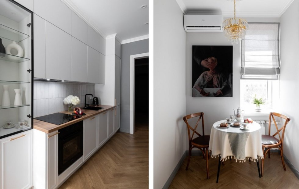 Интерьер оформлен в светлой палитре, а акцентами являются интерьерные картины, элементы декоративного освещения и мебель в ретро-стиле Место: Самара Тип дома: Сталинка Метраж: 58 кв. м Год реализации: 2025 Комнаты: 2 Cанузлы: 1 Высота потолков: 3 м Бюджет: 3 млн рублей Дизайн: Светлана Лепихова Фото: Алеся Горбунова Эта двушка была приобретена заказчиками для коммерческих целей — для последующей продажи. Основной задачей стало выделение квартиры на рынке недвижимости. Дизайнеру Светлане Лепиховой хотелось внести благородные оттенки, подчеркивающие статус жилья и придающие ему характер. Типовую планировку немного скорректировали. В санузел добавили пространство, слегка увеличив его за счет коридора. Вход в спальню, который раньше был проходным через гостиную, теперь перенесли в коридор. В квартире имеется отдельная кухня и две комнаты: в одной обустроили гостиную, а во второй — спальню. Кухня сохранила свои прежние размеры и границы. Гарнитур был изготовлен на заказ, и, несмотря на огра