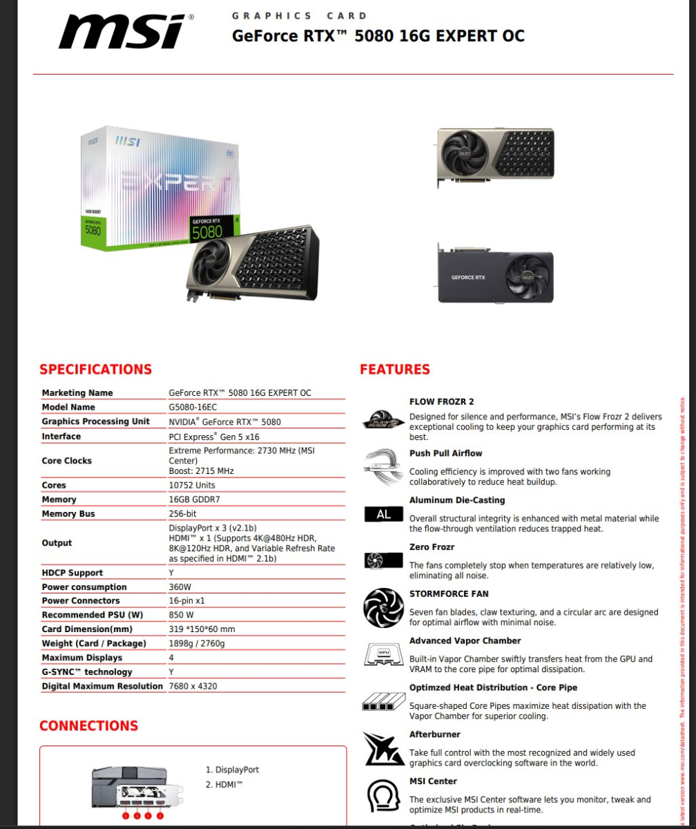MSI представила новую видеокарту RTX 5080 Expert, которая почти полностью повторяет дизайн и технические характеристики предыдущей модели - RTX 4080 Super. Устройство сохранило узнаваемый стиль и конструктивные решения, характерные для серии Expert, и отличается нестандартным для большинства видеокарт охлаждением. Карта оснащена двухвентиляторной системой охлаждения с продуманной циркуляцией воздуха: один вентилятор размещён в нижней части и направляет воздух наружу через зону ввода-вывода, второй - в верхней части, где находится тыльная панель. Таким образом, обеспечивается эффективное удаление тепла из корпуса. Внутри конструкции находится модернизированная испарительная камера с квадратными тепловыми трубками, а вся видеокарта заключена в литой алюминиевый корпус, что добавляет ей жёсткости и прочности. Отличительной особенностью модели является полностью закрытый кожух в стиле турбин, скрывающий все внутренние компоненты. Единственным исключением остаётся разъём питания на 16 конта