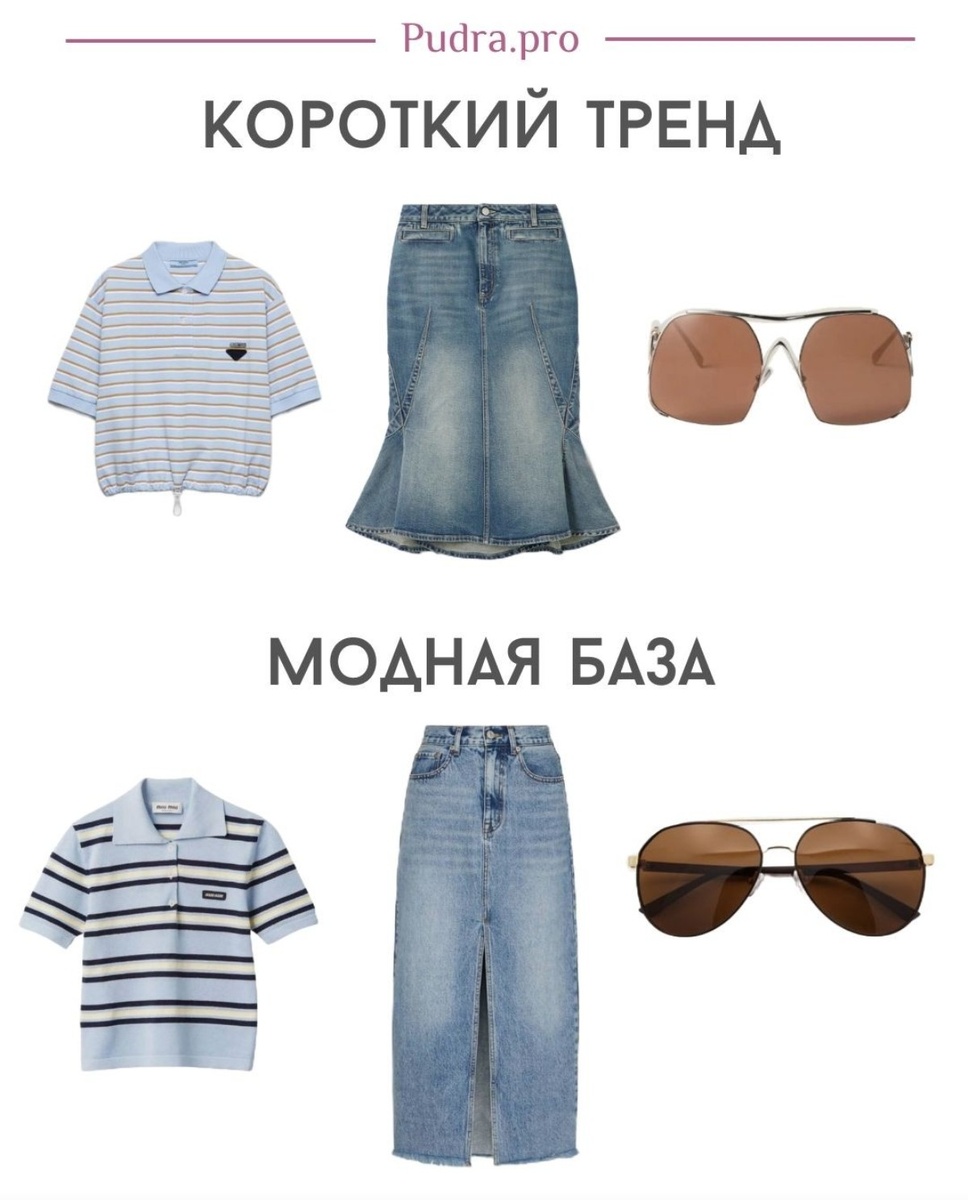По каким признакам распознать одноразовые хиты, которые через год-два пополнят список антитрендов? Как заменить их на модную базу, чтобы носить долго и счастливо? Каждый сезон модная индустрия предлагает новые тенденции, среди которых выделяются такие элементы, как кулиски, юбки годе и очки сложной формы. Эти вещи часто привлекают внимание своей оригинальностью и новизной, однако далеко не всегда становятся основой повседневного гардероба. Сложные конструкции затрудняют создание универсальных образов, требуют особого подхода к подбору аксессуаров и обуви. Кроме того, следующий сезон приносит совершенно новые идеи, оставляя предыдущие в прошлом. Чтобы избежать разочарований и обеспечить гардероб долговечными вещами, рекомендуется обратить внимание на классику, дополненную небольшими акцентами ультрамодных элементов. Это позволит выглядеть стильно и актуально долгие годы. Повторяем образ: ✔️Джинсовая юбка за 3600₽ ✔️Поло за 2200₽ ✔️Кроссовки за 4000₽ ✔️Сумка за 7000₽ ✔️Очки за 3600₽