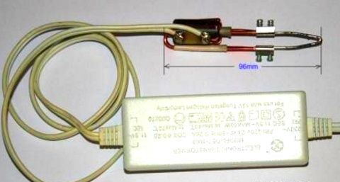 рассмотреть конструкцию импульсного паяльника на основе блока электронного трансформатора. Основная переделка заключается в перемотке импульсного трансформатора. Такие ЭТ предназначены для галогенных ламп с напряжением 12 вольт, при