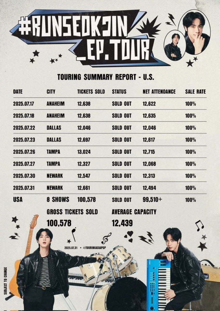 Джин из BTS провел свои концерты в рамках "RunSeokJin_EP tour" восемь раз по четырем городам США Начавшиеся в Анахайме, затем последовали Даллас, Тампа и Ньюарк, выступления собрали аудиторию более чем в 90 000 человек. Турне Джина по США привлекло значительное внимание, установив множество рекордов. Его фан-концерт в Honda Center в Анахайме собрал самую большую аудиторию за всю историю корейского исполнителя. Его выступление в American Airlines Center в Далласе прошло с аншлагом, став первым сольным выступлением корейского исполнителя, продемонстрировавшим ошеломляющую силу продаж билетов. Международные СМИ также оставили восторженные отзывы. Газета Los Angeles Times написала: "Джин провел мастер-класс по общению с фанатами в Honda Center. Его выступление было задумано как особое любовное послание своим поклонникам, наполненное жизнерадостной и утонченной энергией. Джин очаровательно общается со своими поклонниками, передавая свою искренность. Именно за это поклонники любят его. Со