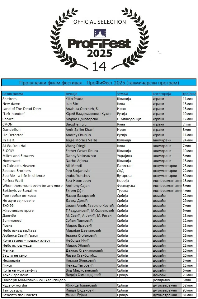 Дамы и господа, рад сообщить, что Сербский кинофестиваль Prokuplje Short Film Festival, в 14-й раз проходящий в Bate Stefanovica 115 Prokuplje 18400 Serbia, включил «Левшу» в конкурсный показ 8-11 сентября 2025 г.