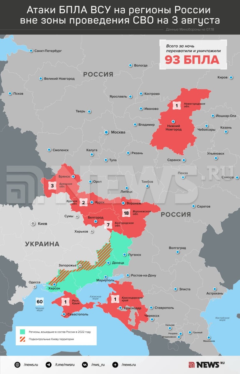 Средства ПВО РФ уничтожили и перехватили за ночь 93 украинских БПЛА, сообщили в Минобороны. Из них 60 — над акваторией Черного моря, 18 — над Воронежской областью, семь — над Белгородской, три — над Брянской, два — над Курской, по одному над Нижегородской областью, Кубанью и Крымом. ⭕ Подписаться | Прислать новость | Буст