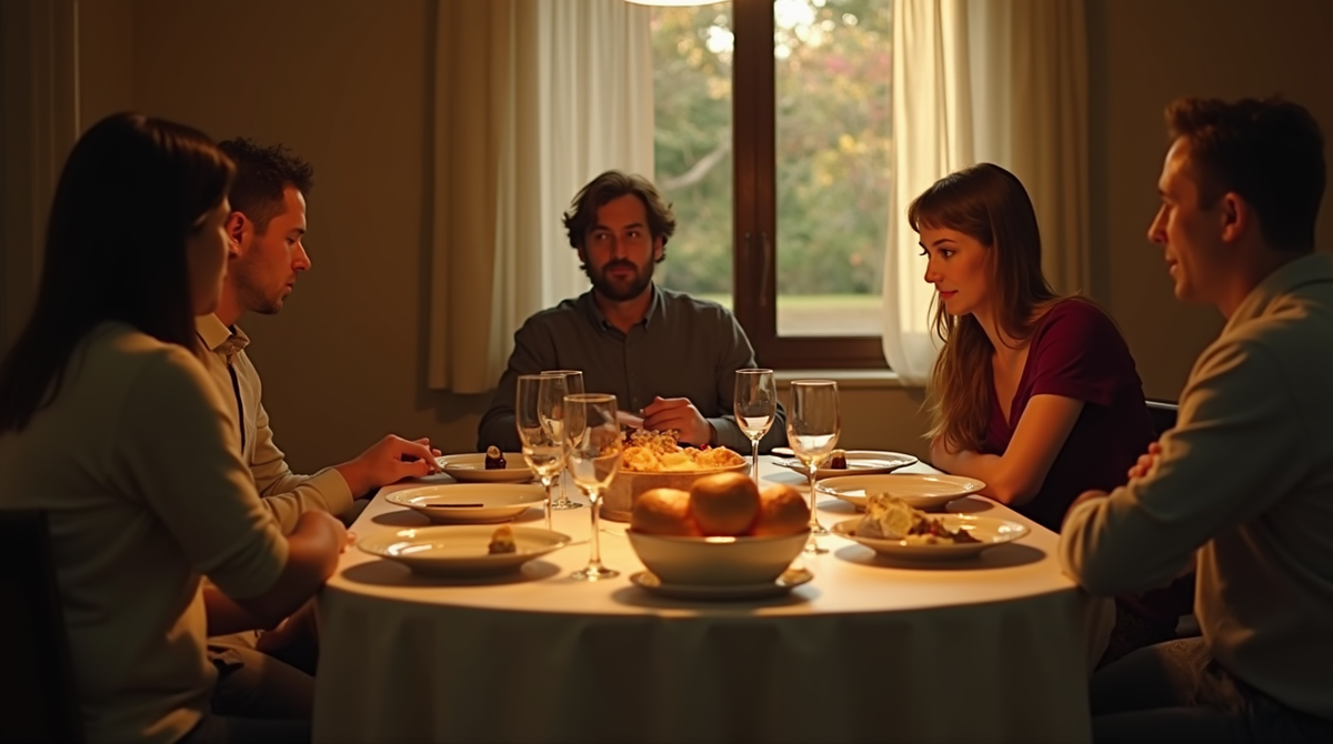 Гости явились к шести. Света, как всегда, с широкой улыбкой, Валера – с громким смехом, Дима – с телефоном. Тётя Нина на этот раз не пришла, но это не сильно облегчило ситуацию. Катя поставила на стол борщ, котлеты, салат. Пирог ждал своего часа в духовке.