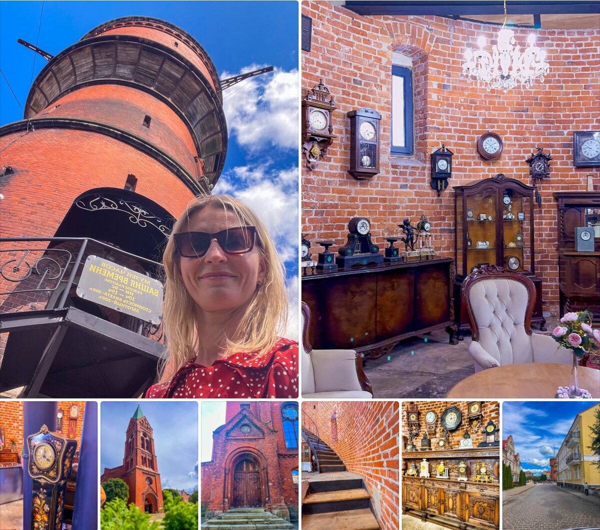 Главная жемчужина нашего путешествия — отреставрированная водонапорная башня Инстербурга, построенная в 1899 году. Сегодня это не просто архитектурный памятник, а музей европейских часов XVIII–XX веков, где каждый экспонат словно останавливает время… и дарит вам чувство настоящего открытия.