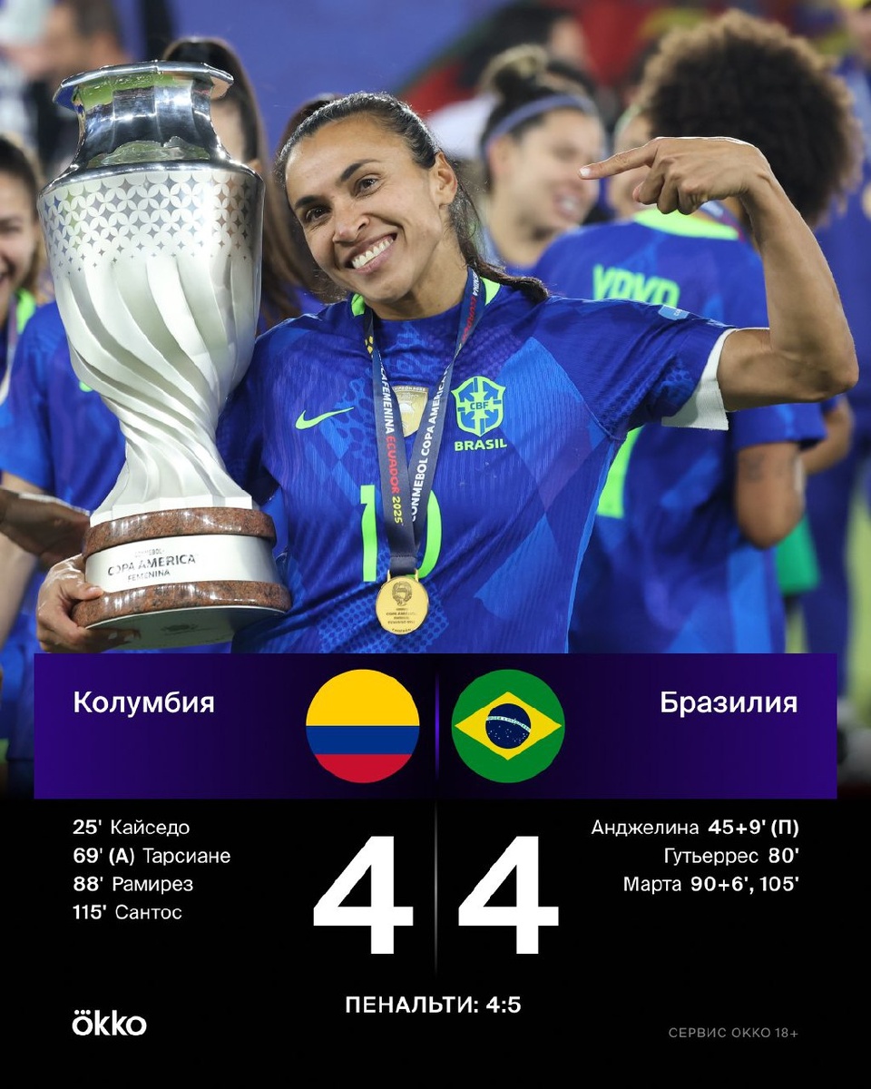 Бразилия выиграла женский Кубок Америки! Что за матч 💥 Невероятная Марта спасла свою сборную на 6-й компенсированной минуте, за секунды до свистка. И каким ударом 😱 Победитель определился в серии пенальти. Сенсации не случилось, но получился лучший финал из возможных.