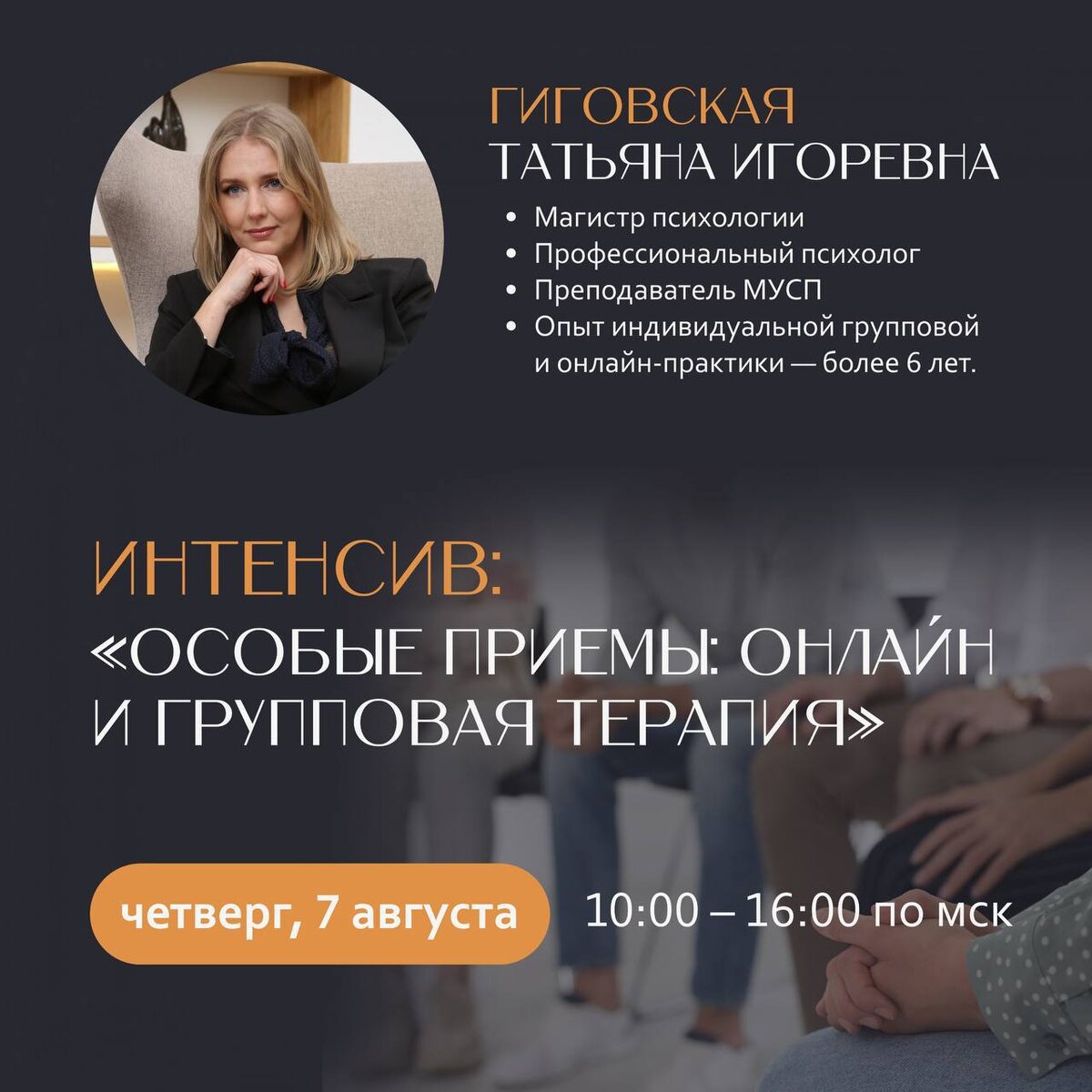 Как уверенно вести онлайн-сессии и группы? Старт уже 7 августа! ➡️ Друзья, на этой неделе мы говорили о групповой терапии — и теперь готовы сделать следующий шаг! Уже 7 августа приглашаем вас на практический интенсив с нашим экспертом, Татьяной Игоревной Гиговской (магистр психологии, преподаватель МУСП, опыт работы 6+ лет). Для кого этот интенсив? ✅ Психологам, работающим онлайн или планирующим перейти в онлайн-формат ✅ Тем, кто ведёт группы и хочет систематизировать свой опыт ✅ Тем, кто избегает групповой терапии из-за страха «не справиться» ✅ Начинающим специалистам, для которых групповые и онлайн-форматы — зона роста ✅ Всем, кто хочет расширить форматы работы и увеличить доход Что вы получите: ⏺ Эффективные методы удержания контакта и глубины в онлайн-консультировании ⏺ Алгоритмы управления групповой динамикой ⏺ Чек-лист подготовки к онлайн-сессии ⏺ Пошаговую схему ведения групповой терапии: от запуска до завершения ⏺ Готовые фразы для работы с сопротивлением и конфликтами ⏺ Уве