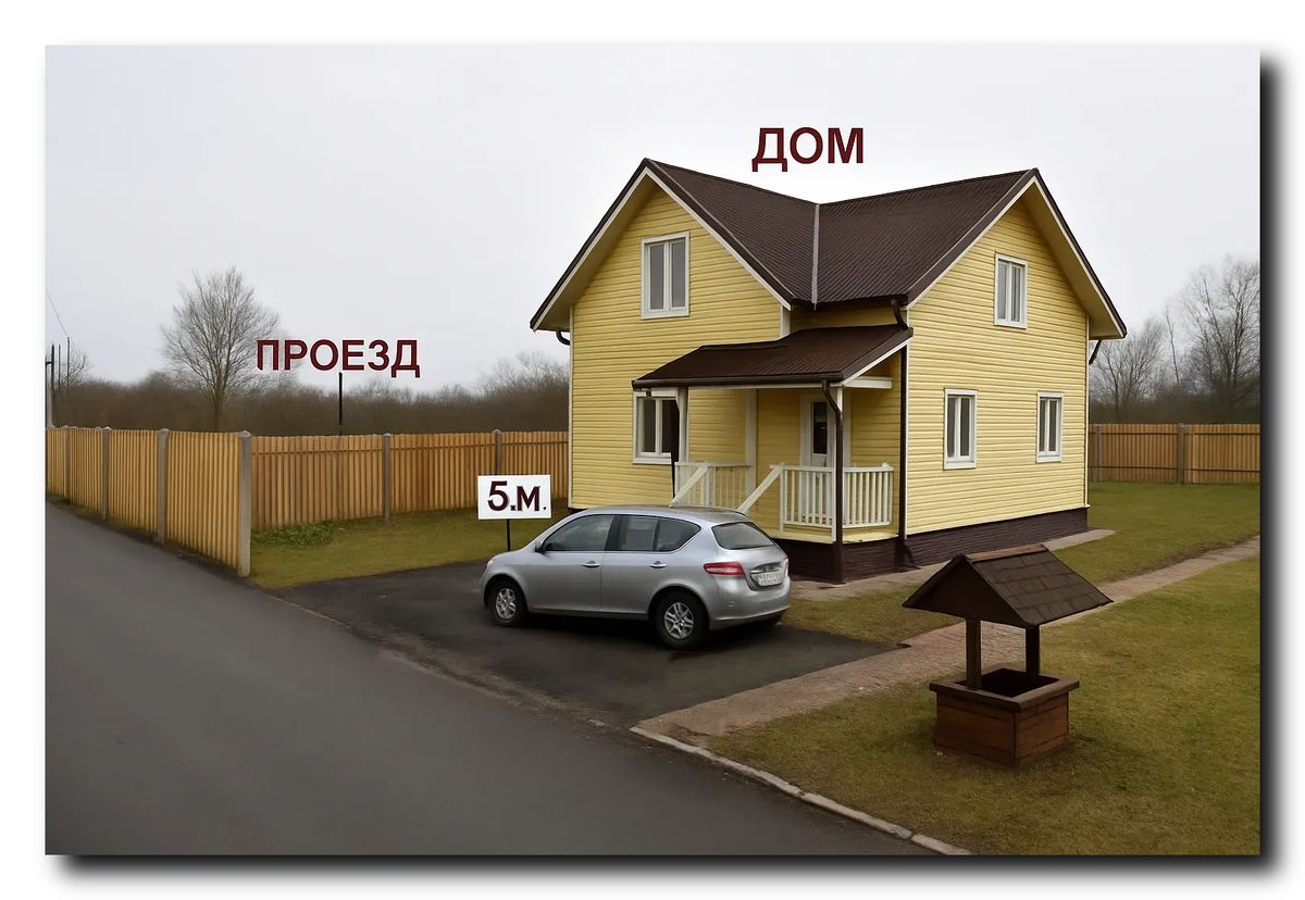 - Норматив: Жилой дом должен располагаться на расстоянии не менее 5 метров от красной линии улицы и не менее 3 метров от красной линии проезда.
