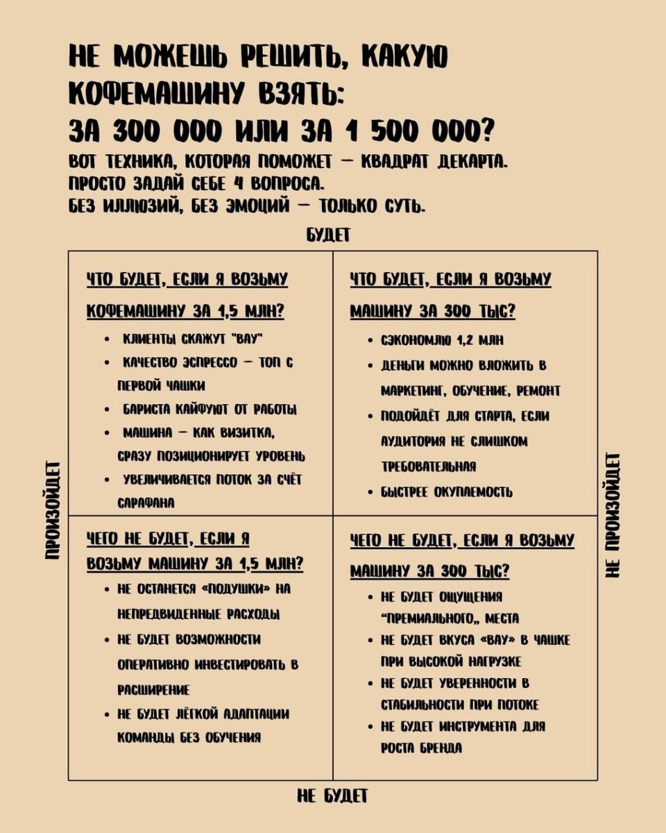 Не можешь решить, какую кофемашину взять: за 300 000 или за 1 500 000? Вот техника, которая поможет — Квадрат Декарта. Просто задай себе 4 вопроса. Без иллюзий, без эмоций — только суть. 1️⃣ Что будет, если я возьму машину за 1,5 млн? — Клиенты скажут "вау" — Качество эспрессо — топ с первой чашки — Бариста кайфуют от работы — Машина — как визитка, сразу позиционирует уровень — Увеличивается поток за счёт сарафана 2️⃣ Что будет, если я возьму машину за 300 тыс? — Сэкономлю 1,2 млн — Деньги можно вложить в маркетинг, обучение, ремонт — Подойдёт для старта, если аудитория не слишком требовательная — Быстрее окупаемость 3️⃣ Чего не будет, если я возьму машину за 1,5 млн? — Не останется «подушки» на непредвиденные расходы — Не будет возможности оперативно инвестировать в расширение — Не будет лёгкой адаптации команды без обучения 4️⃣ Чего не будет, если я возьму машину за 300 тыс? — Не будет ощущения “премиального” места — Не будет вкуса «вау» в чашке при высокой нагрузке — Не будет
