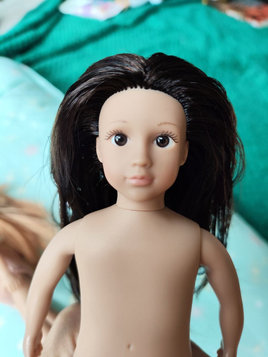Я давно хотела приобрести куколку Лори нового образца. Заказала в известном всем китайском маркетплейсе. Она идет уже третью неделю, а взять потискать хотелось уже сейчас. Я нашла объявление в нашем городе, с продажей вот такой девчушки. Она значительно отличается от той, что я заказала, поэтому решено было ехать за ней. Отличие от кукол Лори старого образца в новом Молде и полностью виниловом тельце. Я не ожидала, что тело настолько квадратное и плоское, что меня немного огорчило. К счастью, в одежде это будет не сильно заметно. Теперь я совершенно ясно понимаю, что старые куколки, которые выходили до 2022 года мне намного больше по душе. У старых Лори бровки нарисованы одной линией, у новых же прорисованы волоски. Если приблизить фотографию, это будет заметно. Прошивка волос как всегда радует, за это лорикам огромный плюс. В таком виде малышка простояла у меня неделю, пока я не сподобилась сшить ей платье. Кофточка была, даже не помню для кого именно я ее покупала, но здесь она очен