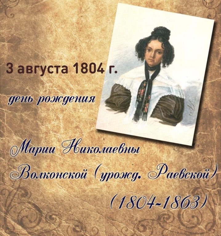 3 августа 1804-го родилась Мария Николаевна Волконская – урожденная Раевская, дочь героя Отечественной войны 1812 года Николая Раевского, правнучка Михаила Ломоносова, будущая жена декабриста Сергея Волконского, добровольно последовавшая за мужем в Сибирь, проведя в изгнании на каторге тридцать долгих лет...