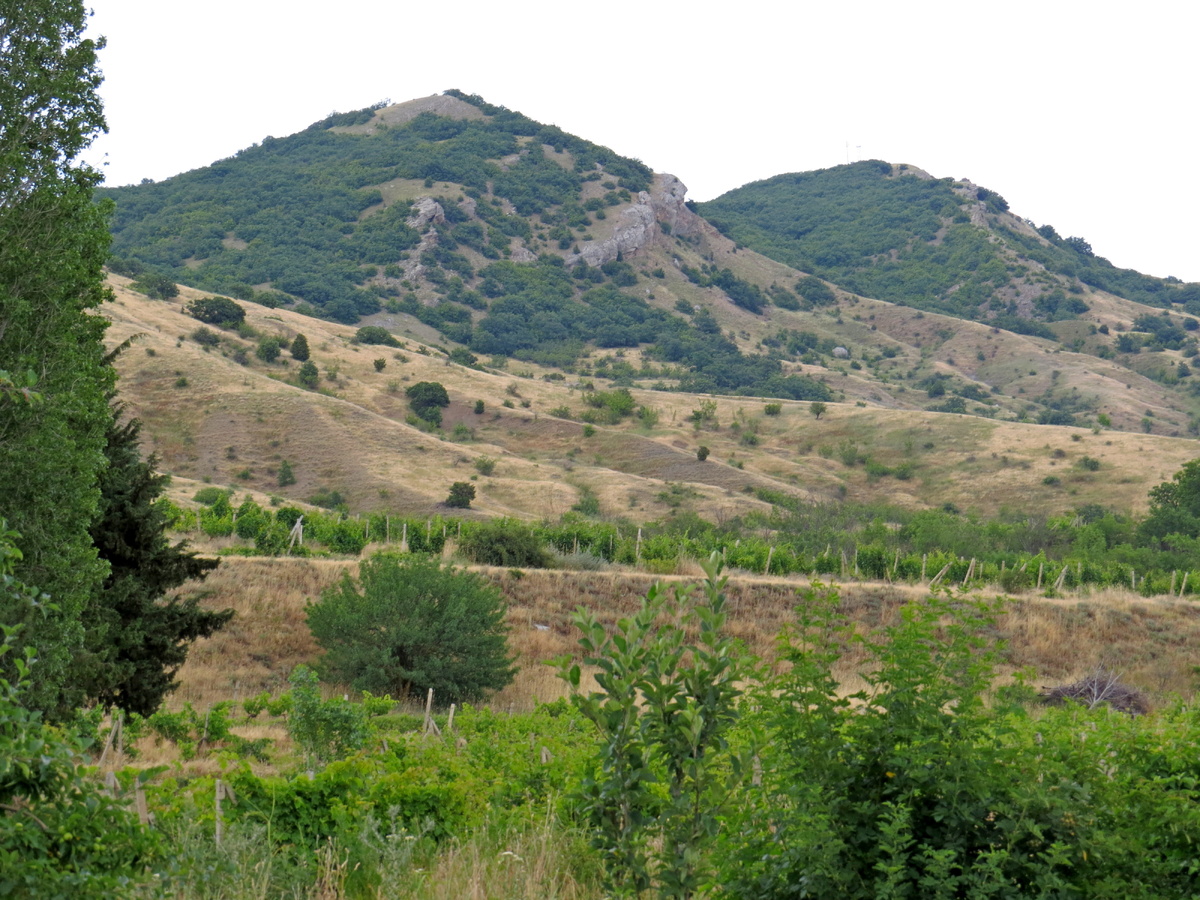 Через две недели, после нашего первого знакомства с новым прекрасным озером и термальным источником за Щебетовкой, мы той же компанией, я и Светлана с мужем, решили еще раз прогуляться к ним. Уж очень нам понравилось место! Это был уже конец июня, лето входило в свои права. Начинали желтеть наши безлесные холмы. Но в этой долине было достаточно зелено. Пусть даже здесь и протекают совершенно маленькие речушки, но, они делают свое дело. День с утра стоял прекрасный! Синее небо, яркое солнце! Но, мы то уже знаем, что можно идти по дороге вдоль леса. А значит, нам солнце нипочём! Виноградники уже набрали свою зелень и украшают наши долины. А как Спящая Красавица замечательно смотрится на его фоне! Идем, любуемся, беседуем. По обочинам еще доцветает разное разнотравье. Летают бабочки, которые ни как не хотят позировать. Чирикают птички. Наливаются зрелостью дикие яблоньки. Вот уже и обходим скалу. Если остановиться и обернуться, увидим горный массив Кара-Даг. Да, Кара-Даг – это не го
