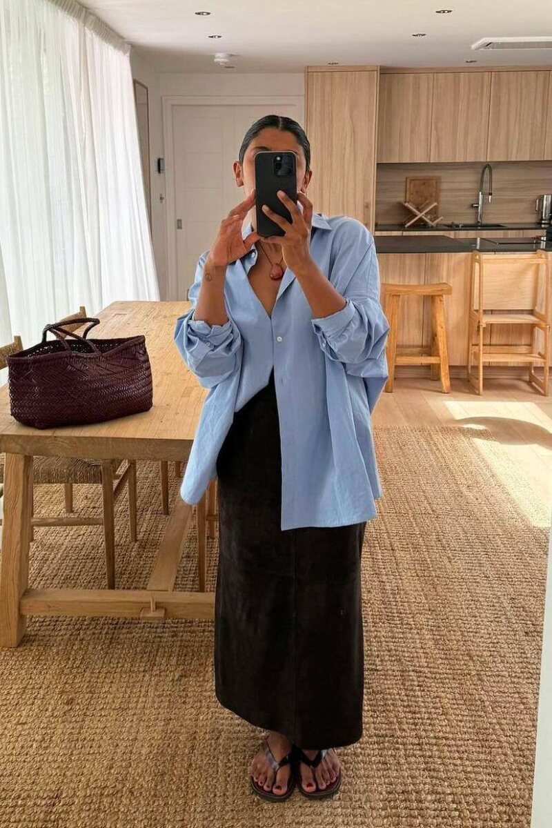 +1 идея образа в деловом стиле 📸 льняная рубашка в голубом цвете юбка макси в черном цвете
