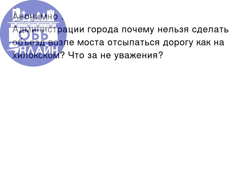 ↗ Анонимно . Администрации города почему нельзя сделать объезд возле моста отсыпаться дорогу как на хилокском? Что за не уважения? vk.com Подробнее на https://vk.com/ob.gorod #городобь #городобьонлайн #толмачево