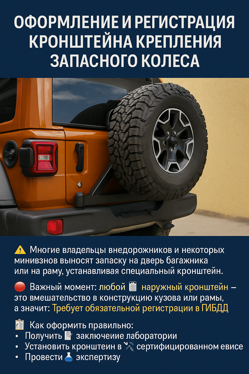 🛞 Кронштейн для запаски — мелочь, которая может стоить штрафа! Многие владельцы внедорожников, минивэнов и коммерческих авто выносят запасное колесо на дверь багажника или раму, устанавливая специальный кронштейн. Это удобно, практично и даже стильно — но... 🛠️ ⚠️ Важно знать: Любой наружный кронштейн — это вмешательство в конструкцию кузова или рамы, а значит: 👉 Требует обязательной регистрации в ГИБДД. 📑 Что говорит закон: Установка кронштейна — изменение конструкции ТС Неоформленное крепление = штраф и отказ в техосмотре Особенно актуально для выносных калиток и кронштейнов с лебёдкой или запиранием ✅ Как оформить правильно: 📋 Получить заключение лаборатории 🛠 Установить в сертифицированном сервисе 🧪 Провести экспертизу 🚓 Зарегистрировать в ГИБДД и внести в ПТС/СТС 💬 Устанавливаешь запаску на кронштейн? Лучше сделать всё по закону — и спать спокойно 😌 #запаска #кронштейн #внедорожник #регистрацияизменений #гибдд #автосервис #автозакон #запасноеколесо #калитка #