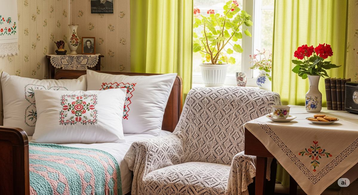 Плед, разложенный на диване, кружевные салфетки, скатерти и подушки — все эти, казалось бы, мелочи собирают пространство в ладную картину. Ткань сохраняет тепло, приглушает звуки и делает комнату мягкой, обволакивающей.