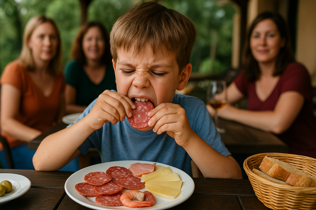 — Ну вот опять, — с раздражением проговорила Катя, глядя на маленького Ваню, который поедал колбасу и сыр.