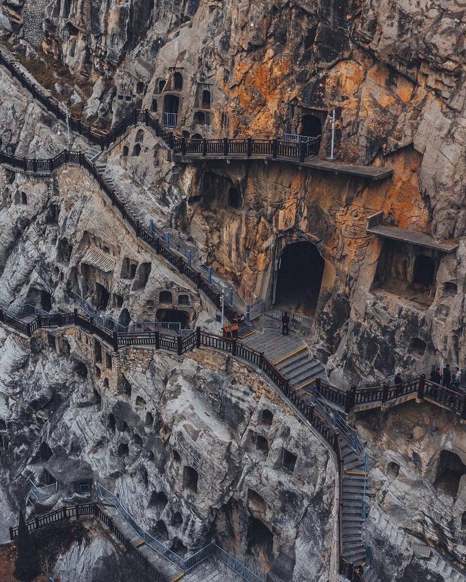 На склонах у реки И, недалеко от древнего города Лоян, спрятаны гроты Лунмэнь — один из шедевров китайской каменной резьбы. Здесь, прямо в скале, вырублены тысячи пещер и ниш, украшенных барельефами, статуями Будды, надписями и орнаментами. Место, где скала стала храмом. Эти гроты создавались в течение нескольких веков, начиная с V века. Всего их более 2300, а число скульптур достигает сотен тысяч — от крошечных, размером с ладонь, до гигантских, высотой с дом. Лунмэнь переводится как «драконовы врата». По легенде, именно здесь драконы поднимались к небесам. И когда ты идёшь по этим узким лестницам, словно пробираешься сквозь дыхание тысячелетий. Не храм, а целый мир, вырезанный в камне. 👉 А вы бы осмелились пройти все ступени Лунмэнь?