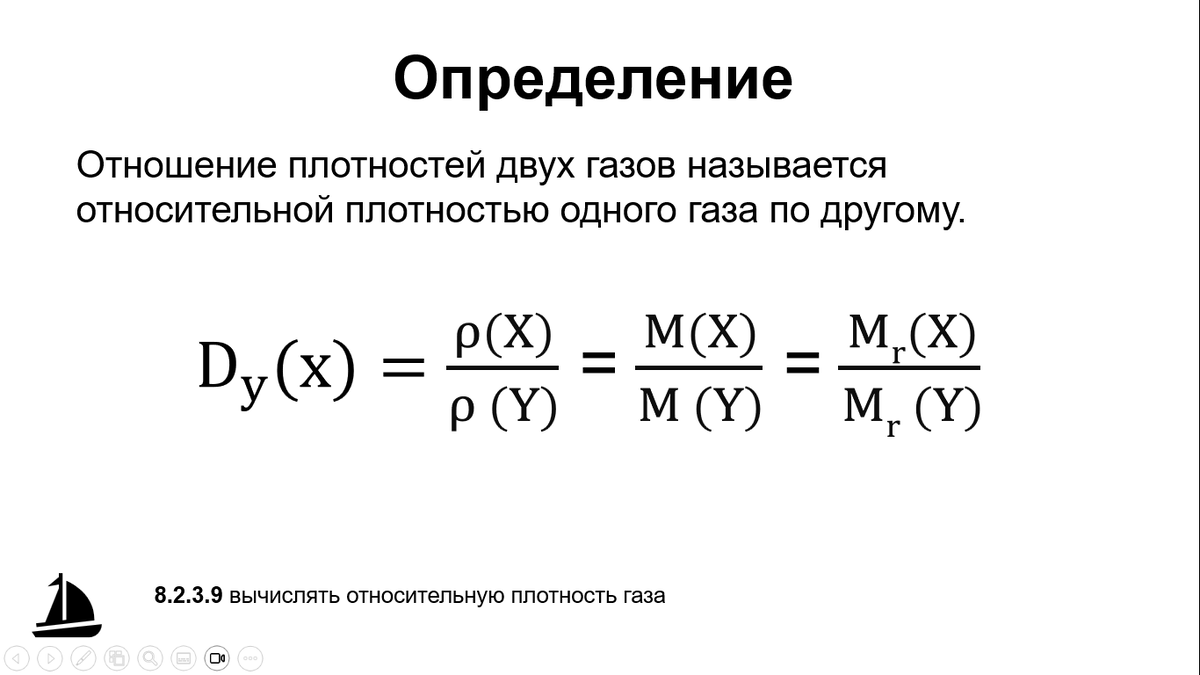 Отношение плотностей двух газов называется относительной плотностью одного газа по другому. Не смотря на то, что нужно делить одну плотность на другую, чаще делят одну молярную массу на другую, так как доказано, что значения выходят те же самые, а молярные массы легко найти в Периодической Таблице. Давайте запомним формулы некоторых газов: В задачах на нахождение плотности будут даваться либо формулы газов, которые Вам известны, либо формулы будут предоставляться. Также нужно знать наизусть молярную массу воздуха. Так как воздух - это не вещество, а смесь веществ, его молярную массу легче запомнить, чем высчитывать. Прослушайте объяснение: