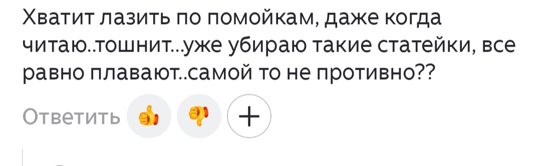 Давненько у нас не было рубрики с ответами на комментарии на злобу дня. Злобными🤭 А их же не убавляется: как же может вдруг исчезнуть желание поучить уму-разуму бедного автора и плюнуть ему в лицо своё бесценное мнение? Кто ж его еще на путь истинный вернёт, правду-матку рубанет? Только залётный читатель, точно знающий, что другим делать нужно, а чего нельзя✊ А что в первую очередь нужно сделать автору? Правильно, вот это👇 Давайте на чистоту. Дзен вам показывает в ленте то, что вас интересует. Открыли вы ж зачем-то статью про мусорки, и мою открыли тоже для чего-то, вот он, бестолковый, и решил, что вам интересно. А вам противно, но читаете. Это, пардон, уже какая-то эмоциональная булимия. Так что лучше разобраться в себе, а не лезть в душу к другим. У меня в ленте рекомендаций нет статей из жёлтой прессы, силиконовых частей тела, скандалов, интриг и расследований, оттого что я их не читаю. И мне их не показывают. Вот так всё просто, представляете? Удивляйтесь, но не всю. И частень