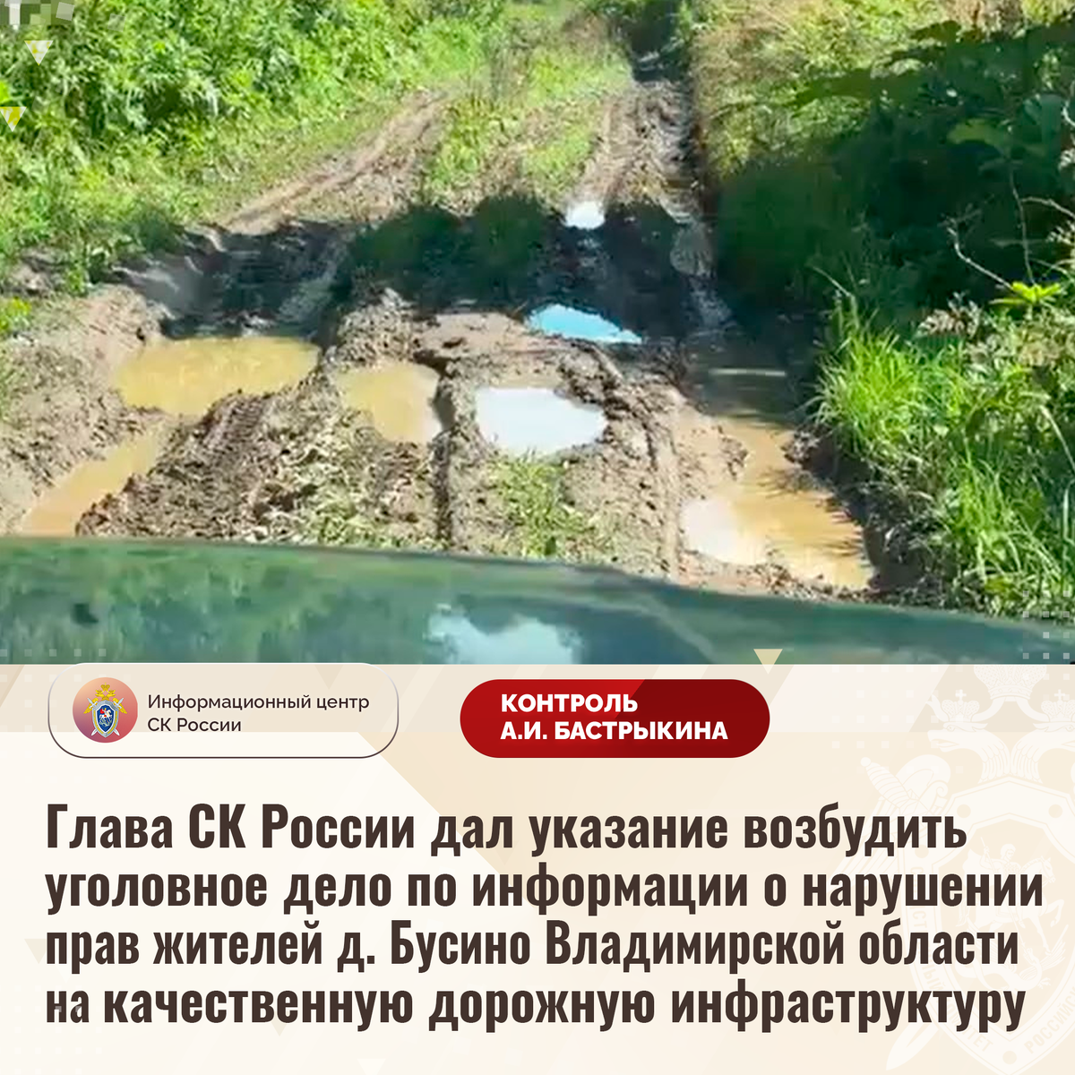 Глава СК России дал указание возбудить уголовное дело по информации о нарушении прав жителей д. Бусино Владимирской области на качественную дорожную инфраструктуру В сети Интернет сообщается о нарушении прав жителей деревни Бусино Владимирской области на качественную дорожную инфраструктуру. Длительное время подъездная дорога находится в непригодном состоянии: асфальтное покрытие отсутствует, на поверхности образовались многочисленные ямы и колеи, грунтовое полотно при выпадении осадков размывается. В связи с этим проезд автомобилей и транспортных средств экстренных служб к домовладениям затруднен. Несмотря на наличие судебного решения, ремонтные работы не организованы. Обращения граждан в компетентные органы результатов не принесли. В региональном следственном управлении по данному факту организована процессуальная проверка. Председатель Следственного комитета Российской Федерации Александр Иванович Бастрыкин дал указание руководителю СУ СК России по Владимирской области Артему Алекса