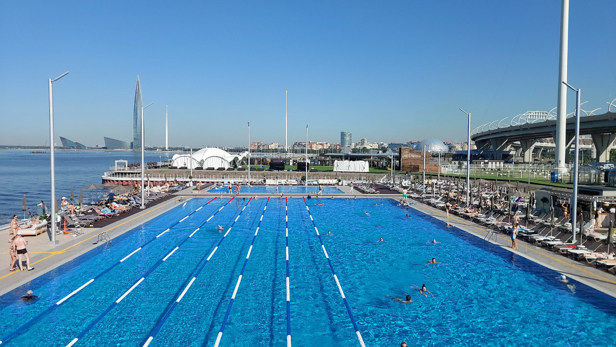 Это свершилось! В Петербурге наконец-то появился открытый бассейн! Причём, где? Прямо напротив стадиона "Зенит" и пространства "Флагшток". Бассейн круглогодичный. Обязательно схожу осенью и зимой. Билеты не сильно дороже одноразового посещения в обычном фитнес клубе. При этом сервис и обстановка на высшем уровне. Билеты трёх видов: стандарт, комфорт и детский. Есть скидки и льготы. Это всё надо на сайте смотреть. Вот здесь 👇 https://flagshtock.ru/pool#qwer Билеты можно купить и на месте. В день несколько сеансов с 7:00 до 20:00 Я взял стандартный билет на 9:00 в воскресенье 3 августа. Он мне обошёлся со скидкой в 2 380р. Вот промокод на скидку: 25POOL20 Без скидки, стандарт: 2800р. В будни, дешевле: 2000р. Комфорт будет дороже. (От 3600р в выходные, в будни от 2600р.) Чуть позже расскажу в чём отличие. В самом начале вы подходите на кассу, где ваш билет обменивают на браслет-ключ для вашего шкафчика в раздевалке. Вот так выглядит раздевалка. Теперь интересно, что в "к