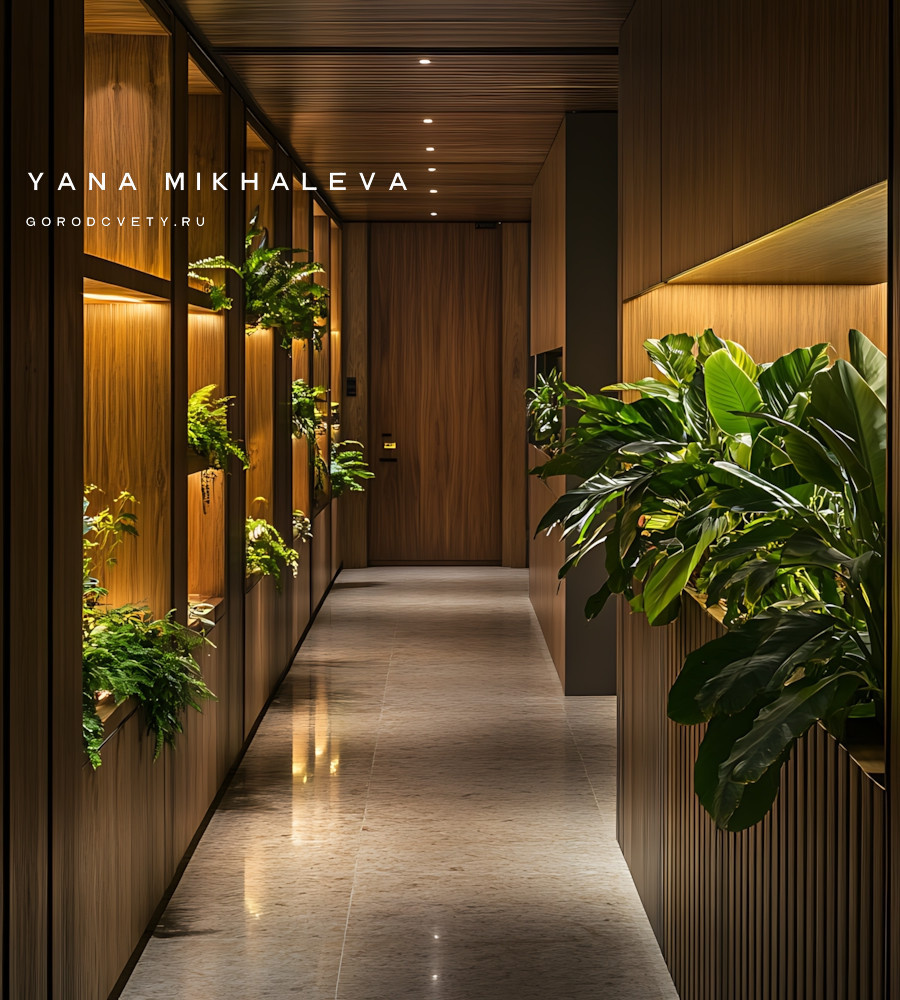 Зелёные растения в интерьере лобби, на ресепшене или у лифтов — это визуальный маркер заботы. Гость только вошёл, а его уже встречает фикус, папоротник или стильная мховая стена. Это как плед на кресле — вроде мелочь, а чувство тепла и уюта уже появилось.