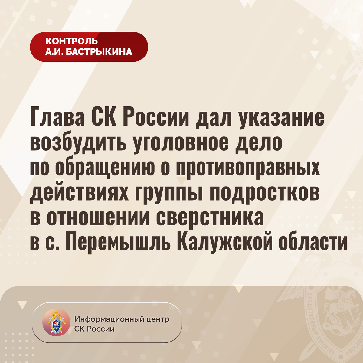 Глава СК России дал указание возбудить уголовное дело по обращению о противоправных действиях группы подростков в отношении сверстника в с. Перемышль Калужской области К главе СК России А.И. Бастрыкину в его приёмную «ВКонтакте» обратилась жительница Калужской области. Она сообщила, что в октябре прошлого года группа несовершеннолетних избила ее 16-летнего сына, причинив ему телесные повреждения. Обращения заявительницы в правоохранительные органы результатов не принесли, до настоящего времени к ответственности никто не привлечен. Председатель Следственного комитета Российской Федерации Александр Иванович Бастрыкин дал указание руководителю СУ СК России по Калужской области Марку Сергеевичу Харламову возбудить уголовное дело и представить доклад об установленных в ходе первоначальных следственных действий обстоятельствах, а по завершении расследования – о его результатах. Исполнение поручения поставлено на контроль в центральном аппарате ведомства. #СледственныйКомитет #СКРоссии #СКР