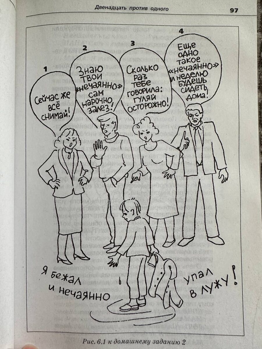 ДОМАШНИЕ ЗАДАНИЯ К уроку «12 против одного» ✅Задание первое Попробуйте определить, к какому типу ошибочных высказываний относится ответ родителя (ключ вы найдете в самом конце этого поста) ДОЧЬ: Никогда не пойду больше к зубному! МАТЬ: Не выдумывай, на завтра у нас талончик, надо долечивать твой зуб. (1) ДОЧЬ: Я больше не выдержу. Знаешь, как было больно! МАТЬ: Не умерла же. В жизни часто приходится терпеть. А не будешь лечить, останешься без зубов. (2) ДОЧЬ: Тебе хорошо говорить, тебе так не сверлили! И вообще ты меня не любишь! СЫН: Представляешь, я пропустил две последние тренировки, и тренер продержал меня сегодня в запасе. МАТЬ: Ну, ничего, кому-то там тоже надо сидеть, не ты, так другой мальчик, а потом - сам виноват. (3) СЫН: Пусть другой сидит, а я не хочу. Это ведь несправедливо: Петров слабее меня, а его поставили играть. МАТЬ: Откуда ты знаешь, что он слабее? (4) СЫН: Знаю! Я один из лучших в команде. МАТЬ: Я бы на твоем месте так не заносилась, надо быть более скромным.
