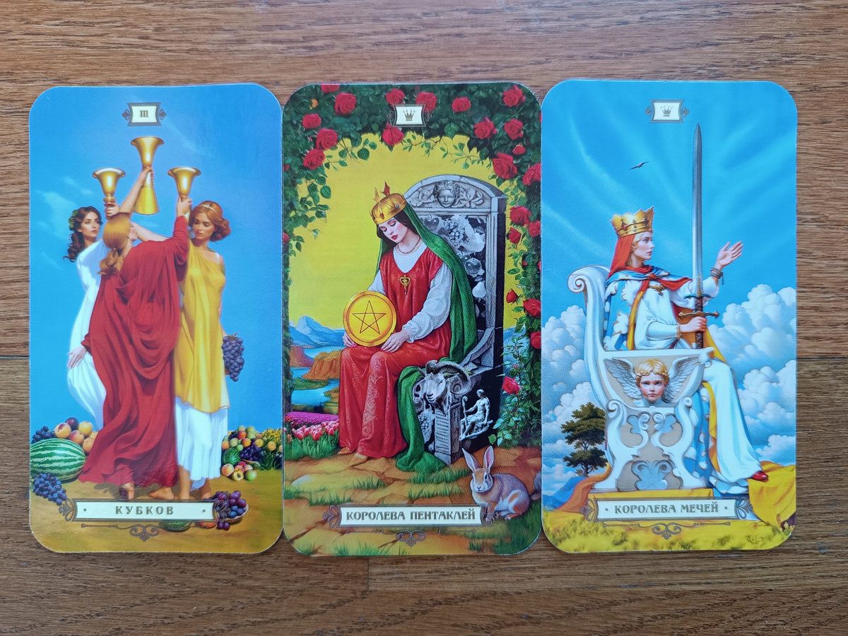 Три карты раскрыли перед нами удивительную историю: от праздничного флирта (Три Кубков) через тёплую заботу (Королева Пентаклей) к решающей ясности (Королева Мечей). Вас ждёт месяц, где шампанское эмоций перельётся в глубокие разговоры, а мимолётные взгляды – в важные решения.