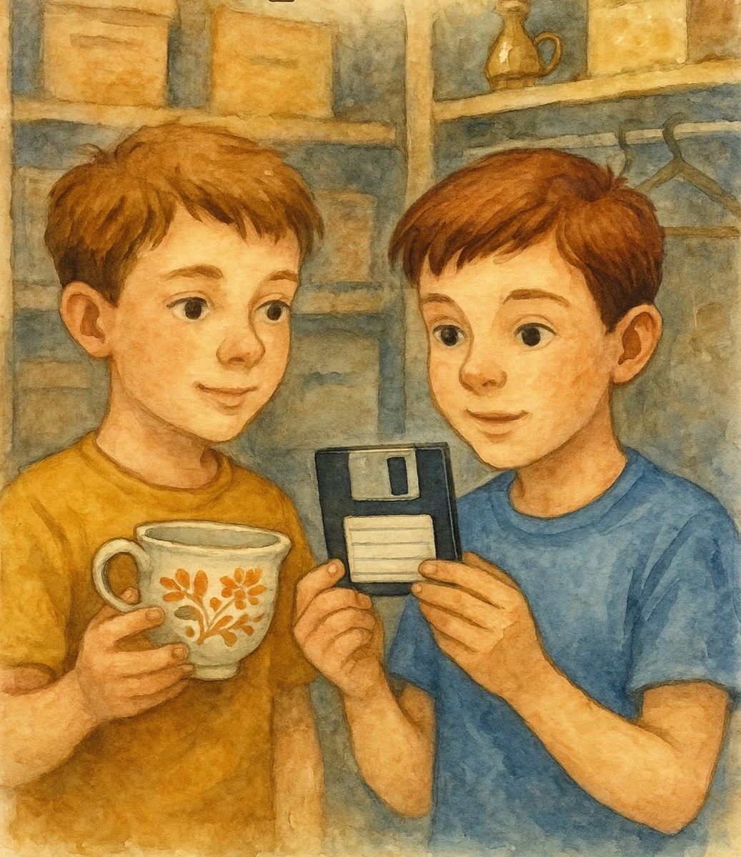 Лёша и Никита играли в археологов. Дедушка разрешил им залезть в кладовку, и братья перебирали старые вещи. Они представляли себя исследователями, раскопавшими древний храм. - Коллега, я нашёл кости динозавра, - говорил Лёша, разглядывая старые вешалки. Никита поднял щербатую чашку: - А у меня - древний сосуд. Древние греки изобразили на нём древнегреческие цветы и древнегреческие листья. Очень похожи на современные. Лёша выдвинул коробку из-под полки и услышал, как за ней что-то упало. Мальчик пошарил под полкой рукой и достал плоскую пластиковую коробочку. - А это что? - Никита протянул руку к находке, но Лёша прижал её к себе. - Это я нашёл, значит, моё! - Дай хоть посмотреть, я даже разглядеть не успел. Лёша дал брату пластиковую коробочку, и тот начал вертеть её в руках. Коробочка была квадратной и синей, без надписей. Она напоминала упаковку для DVD-дисков, только была слишком маленькой. На боковине виднелась прорезь. Никита поддел ногтём прорезь, и коробочка раскрылась. Вн
