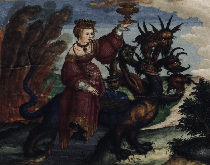 Женщина сидит на чудовище с семью головами и десятью рогами. Она одета в порфиру и багряницу цвета императорской власти. Золото, драгоценные камни, жемчуг, богатство, которому позавидовали бы цари. В руке золотая чаша, полная “мерзостей и нечистоты”.