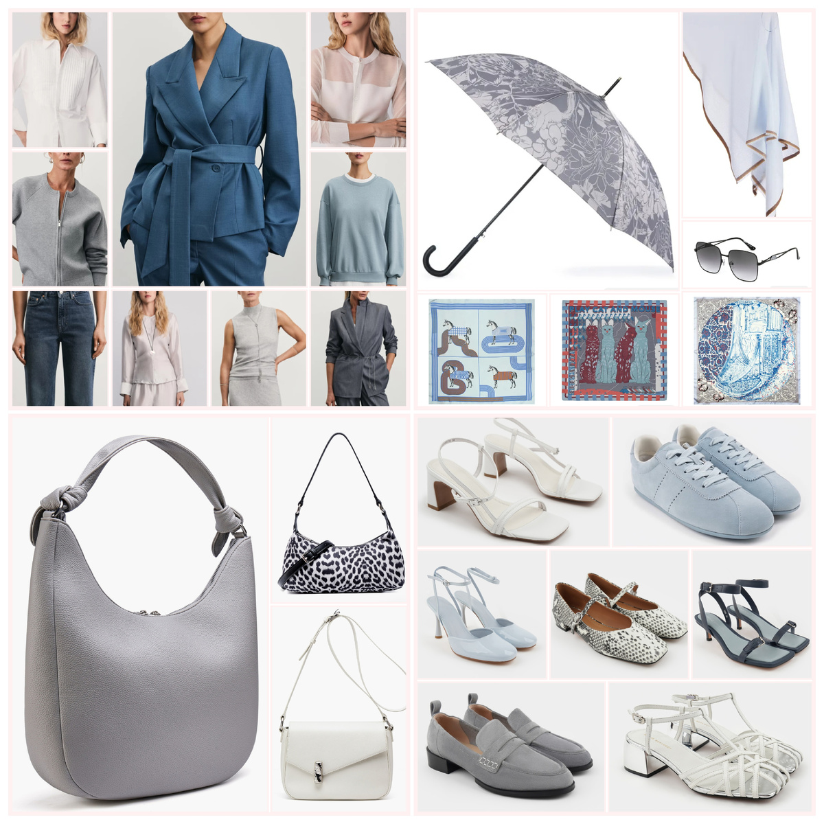 Начнем с того, что я сама такое люблю. Помните, недавно я показывала вам свой серо-белый образ? Это близкое по идее. В этом посте большая капсула, собранная из 6 магазинов. Ссылки будут на все в телеграме. Кое-где сейчас очень хорошие цены. Поэтому я прикинула, что будет интересно с прицелом на конец лета и на начало осени и собрала большой вариант обновления гардероба. Есть даже зонт, часы и украшения. Палитра спокойная: голубой, сизый, серый, белый. Черный и красный только вкраплениями. Вполне удачное сочетание, чтобы выйти на работу. Есть четыре костюма и комбинация: джинсы, кеды и свитшот для прогулочных вариантов. Ну, и украшения я сегодня в серебре вывела в акцент. В такой капсуле они необходимы. Тут варианты на выбор одного цвета, но чуть разного дизайна, они чуть отличаются формой и идут для разных тиражей. Прошлый раз я создала гардероб в теплой яркой гамме, сегодня впечатление иное - холодное и спокойное. Сизый оттенок относится к холодной гамме синего цвета, а серый являе