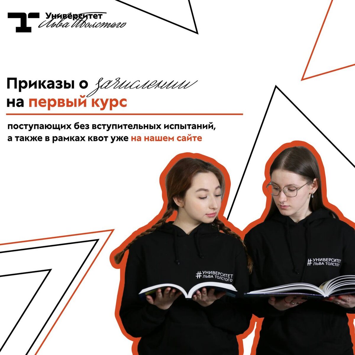 📋 На сайте Университета Льва Толстого опубликованы приказы о зачислении на первый курс поступающих без вступительных испытаний, а также в рамках квот.