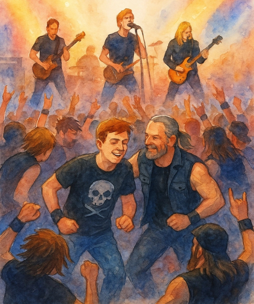 В концертном зале гремела тяжелая музыка. Барабаны стучали ритмом сердца, гитары пели, пронизывая энергией танцпол. Стас наконец-то смог расслабиться после сложной недели на учёбе. Особенно надоели пары экономики. То расчеты неверные, то неправильно указан термин, то ещё какая-то ошибка - преподаватель будто специально придирался. Любимый исполнитель кричал в микрофон, зал хором подпевал, у сцены прыгали и трясли головой девчонки. Стас нырнул в кипучую кашу слэма и отвёл душу, раздавая толчки таким же разгорячённым ребятам. После очередной песни Стас вытер рукой пот, подбежал к бару за пивом и обомлел. У барной стойки сидел преподаватель экономики и пил виски. Строгий костюм профессор сменил на байкерский наряд. Кожаную жилетку покрывали нашивки известных рок-групп. - Сергей Савельевич? - ошарашенно спросил студент. Преподаватель повернулся к нему и слегка улыбнулся. - Здравствуй, Стас. Тоже пришёл отдохнуть? Ответить Стас ничего не успел - началась следующая песня, и он переста