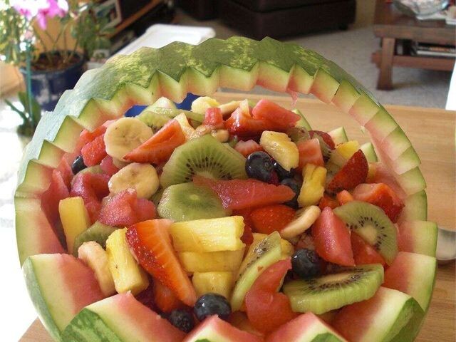 Арбузная фруктовая чаша Все ваши любимые фрукты, слегка подслащенные, подаются в арбузной "чаше". ⌛ Подготовка: 30 мин. ⏰ Приготовление: 50 мин. 🍴 Количество: 20 порций Ингредиенты ✅ 1 большой арбуз ✅ 1 канталупа, разрезанная пополам и очищенная от семян ✅ 1 медовая дыня, разрезанная пополам и очищенная от семян ✅ 2 (450 гр) банки мандариновых апельсинов, осушенных ✅ 2 (600 гр) банки кусочков ананаса, осушенных ✅ 2 чашки разрезанной пополам свежей клубники ✅ 2 чашки винограда без косточек ✅ ½ чашки воды ✅ ¼ чашки белого сахара ✅ 2 столовые ложки тертой лимонной цедры. Инструкция приготовления 1. Большим острым ножом снимите 1/4 часть арбуза. С помощью дынного шарика зачерпните мякоть изнутри арбуза, удалив как можно больше семян. Оставьте 1/5.00 см мякоти внутри оболочки арбуза. Аналогичным образом очистите канталупу и медовую росу, удалив как можно больше мякоти и отбросив кожуру. Охладите фрукты отдельно, пока они не будут готовы к сборке. 2. В небольшой кастрюле на средне-в