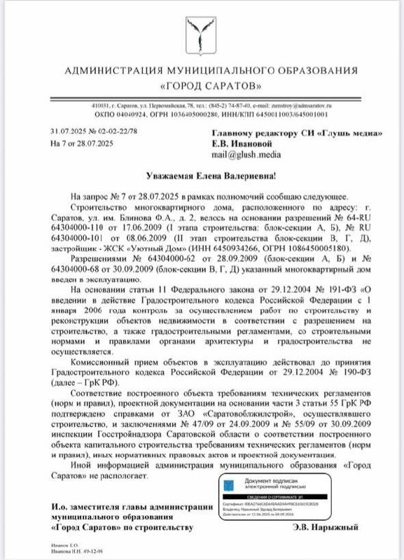 «Глушь медиа» отправили запрос в мэрию Саратова и всё узнали. Дом возводил «Саратовоблжилстрой», застройщиком выступал ЖСК «Уютный дом». По документам дом возвели за три месяца всего.